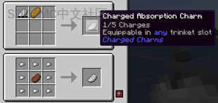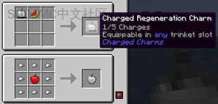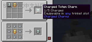 Charged Charms (Charged Charms)Github |相关wiki |源站链接支持: fabric , forge , neoforgeAdds several Charged Curios or Trinkets for balanced gameplay. Charms included are regeneration, absorption, speed, totem of undying and hit mob glow effect. Charged Charms is a mod that adds several Charged charms that are designed to have a set number of charges for the given effect. This allows for balanced server play when utilizing the charm abilities. Each Charged Charm can be recharged with an item corresponding to the charm (up to 5 charges). REI and JEI recipe compatible for recharge recipes.