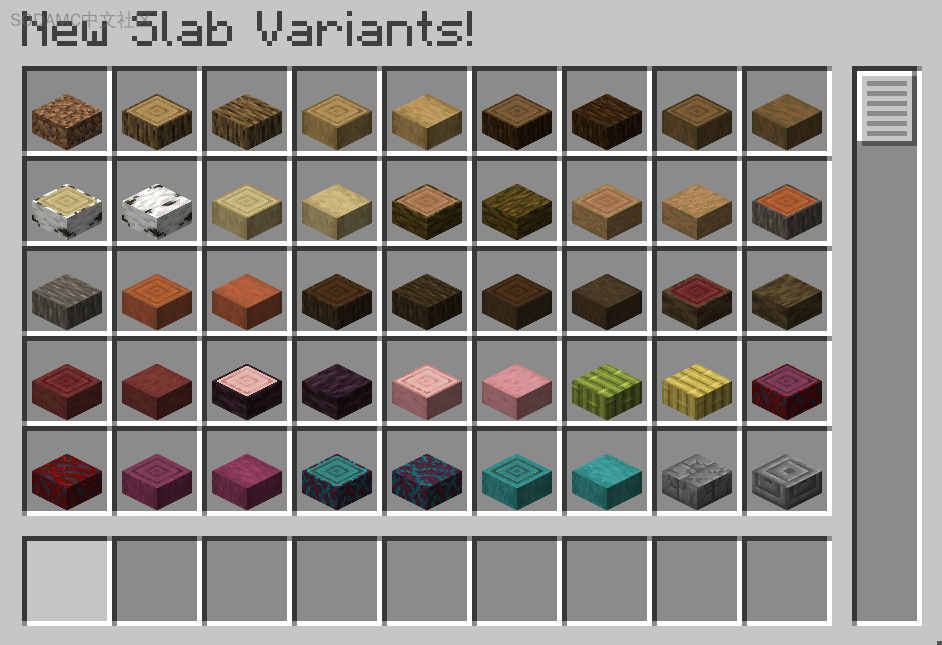 新石板变体 (New Slab Variants)Github |相关wiki |源站链接支持: fabric , forge , neoforge游戏中每个方块都应该有石板吗?从现在开始,玩家将拥有超过200种新的石板,这些石板的纹理与游戏的基础方块相似!
