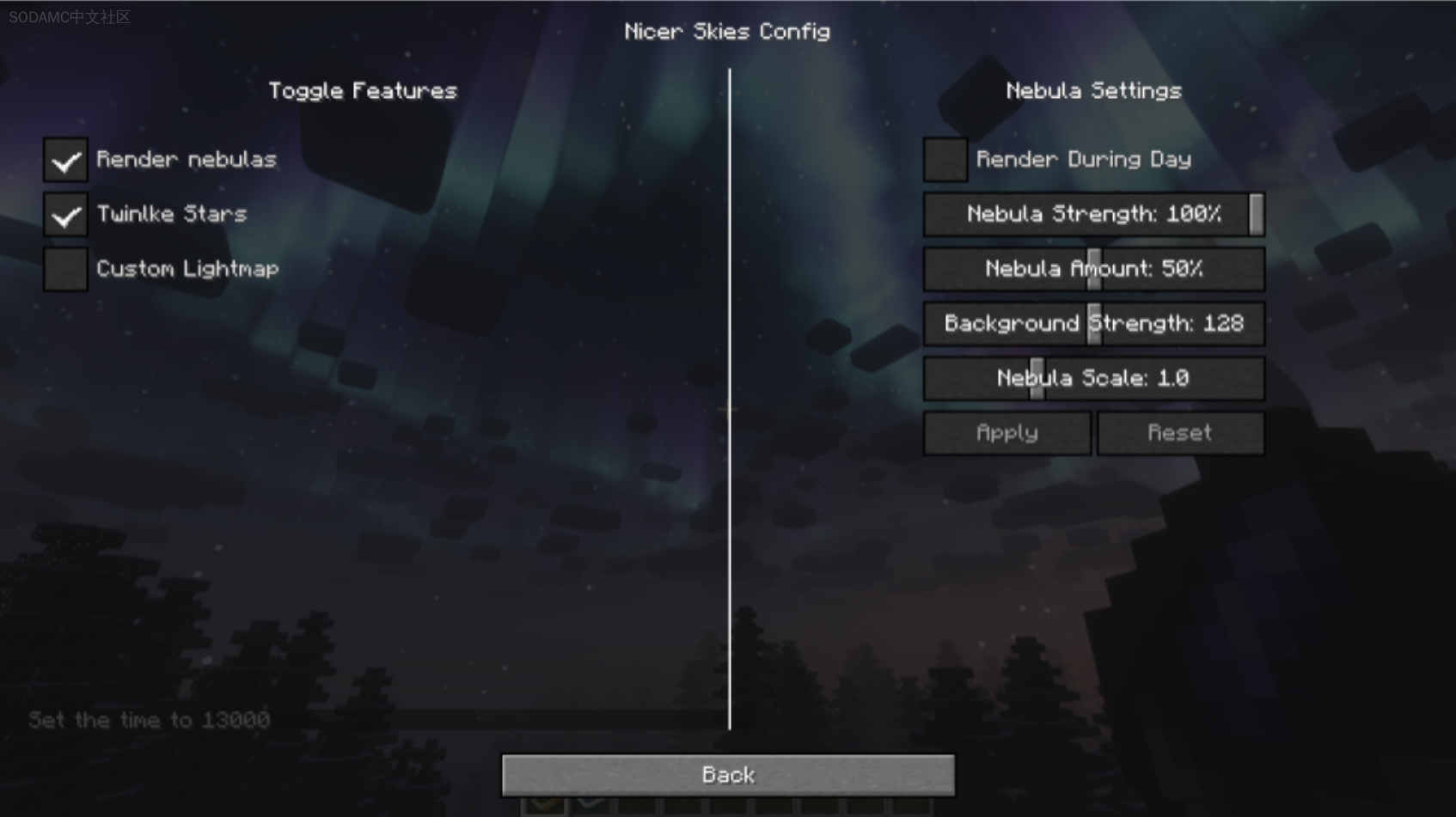 Nicer Skies (Nicer Skies)Github |相关wiki |源站链接支持: fabric , quiltA mod which adds nebulas and changes stars and light.