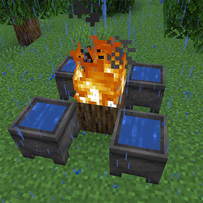 雨神赐福仪式是一个为生存模式玩家提供(略微)逻辑的停止雨水方式的模组。您只需要一些炼金炉、一根木头和一把打火石。将炼金炉(最少4个,最多8个)放在木头周围并点燃木头。仪式结束后会有一个无害的爆炸效果,炼金炉会装满水,雨水也会停止。查看下面的gif以了解效果。