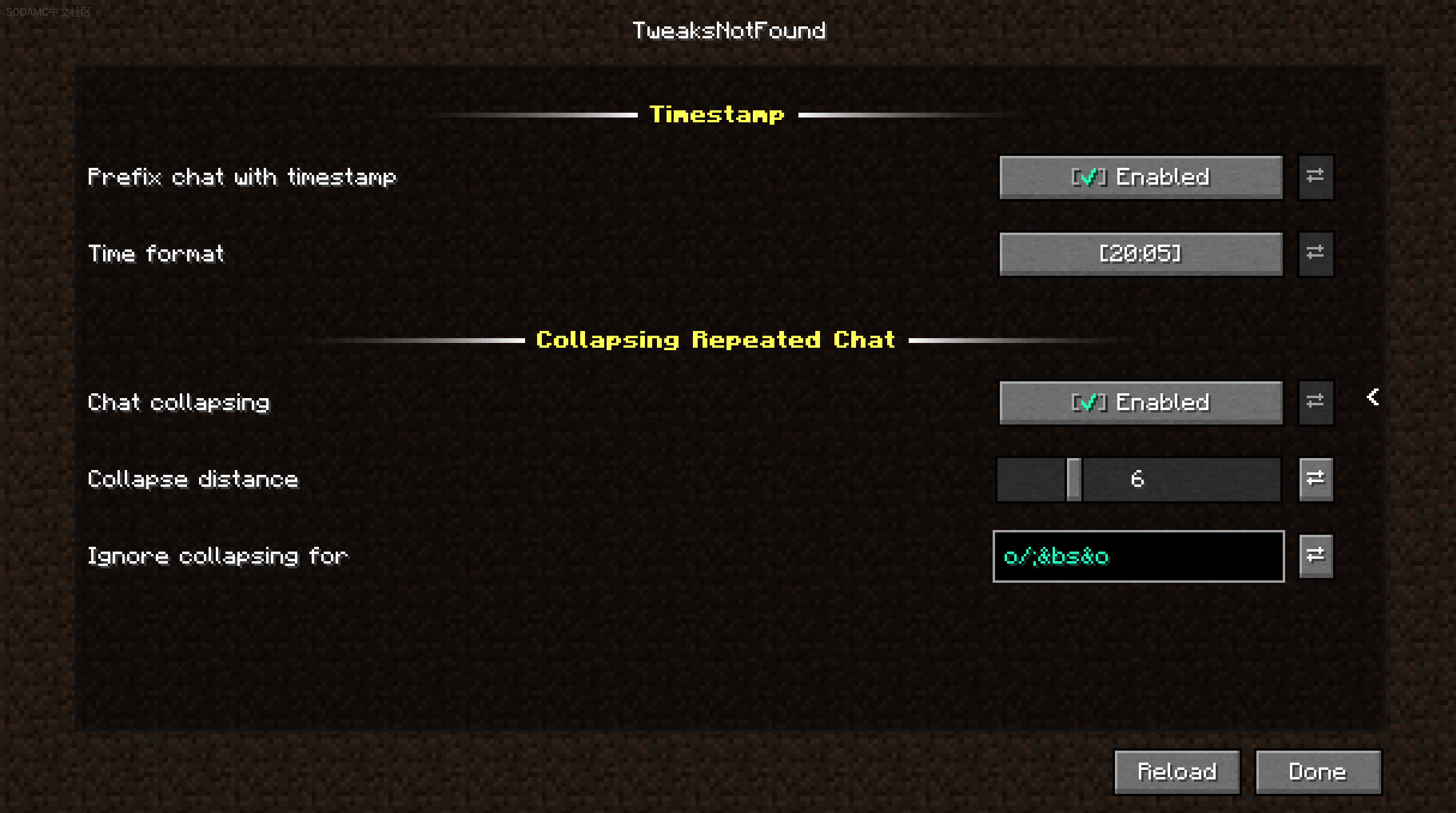 来自Modrinth所有游戏版本1.19所有类型fabric1.1.0tweaks_not_found-1.1.0+1.19.jar下载1.1.0#Release## What\'s Changed* Fix AM/PM lowercase bug by @CodexNotFound in https://github.com/CodexNotFound/TweaksNotFound/pull/21* Add \'rejoin\' messages by @CodexNotFound in https://github.com/CodexNotFound/TweaksNotFound/pull/23* Add mention highlighter by @CodexNotFound in https://github.com/CodexNotFound/TweaksNotFound/pull/25**Full Changelog**: https://github.com/CodexNotFound/TweaksNotFound/compare/v1.0.1...v1.1.0展开版本: 1.1.0支持游戏: 1.19类型:FabricRelease下载次数: 1261.0.1tweaks_not_found-1.0.1+1.19.jar下载1.0.1#ReleaseThis release fixes 2 big bugs causing the chat to stop working or even crash the whole game. It has also added an option to have a 12-hour clock instead of the 24-hour clock.## What\'s Changed* Crash after joining server by @CodexNotFound in https://github.com/CodexNotFound/TweaksNotFound/pull/14* Fix backslash issue by @CodexNotFound in https://github.com/CodexNotFound/TweaksNotFound/pull/17* 12-hour clock by @CodexNotFound in https://github.com/CodexNotFound/TweaksNotFound/pull/18**Full Changelog**: https://github.com/CodexNotFound/TweaksNotFound/compare/v1.0.0...v1.0.1展开版本: 1.0.1支持游戏: 1.19类型:FabricRelease下载次数: 99全部版本