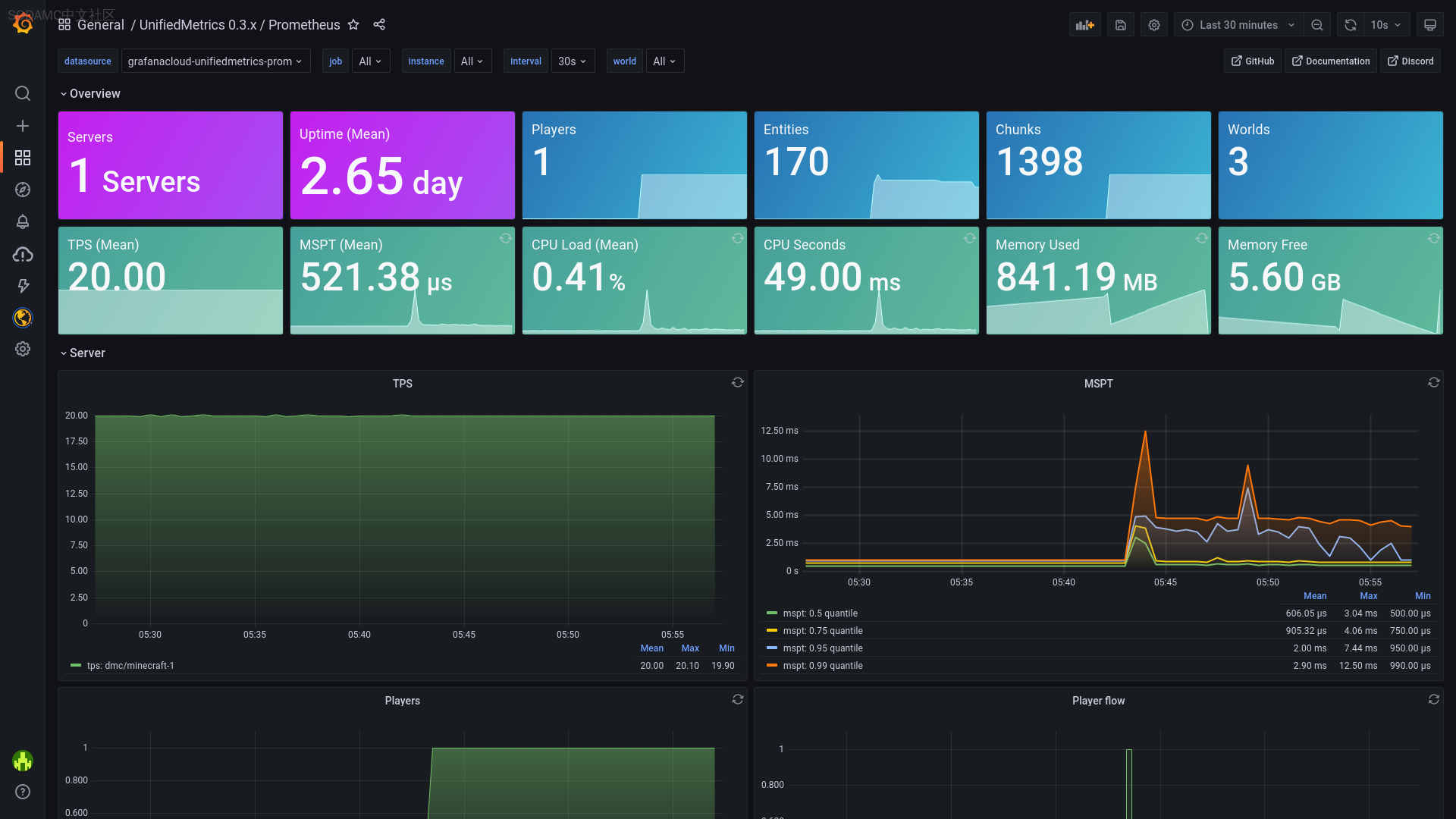 UnifiedMetrics (统一度量)Github |相关wiki |源站链接支持: bukkit , bungeecord , fabric , paper , purpur , spigot , velocity , waterfallUnifiedMetrics是一个专为Minecraft服务器开发的功能齐全的度量收集插件,支持Prometheus和InfluxDB。