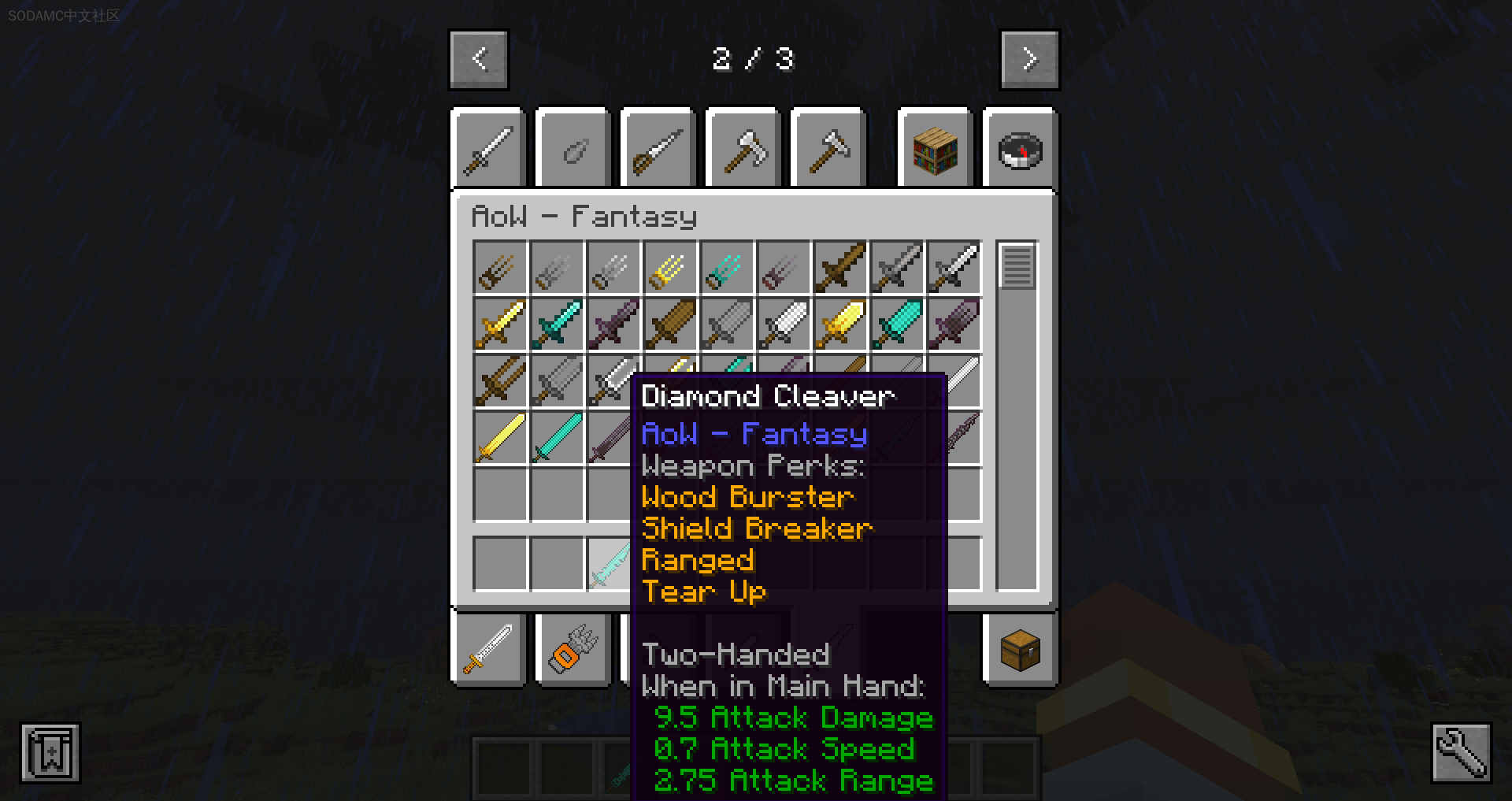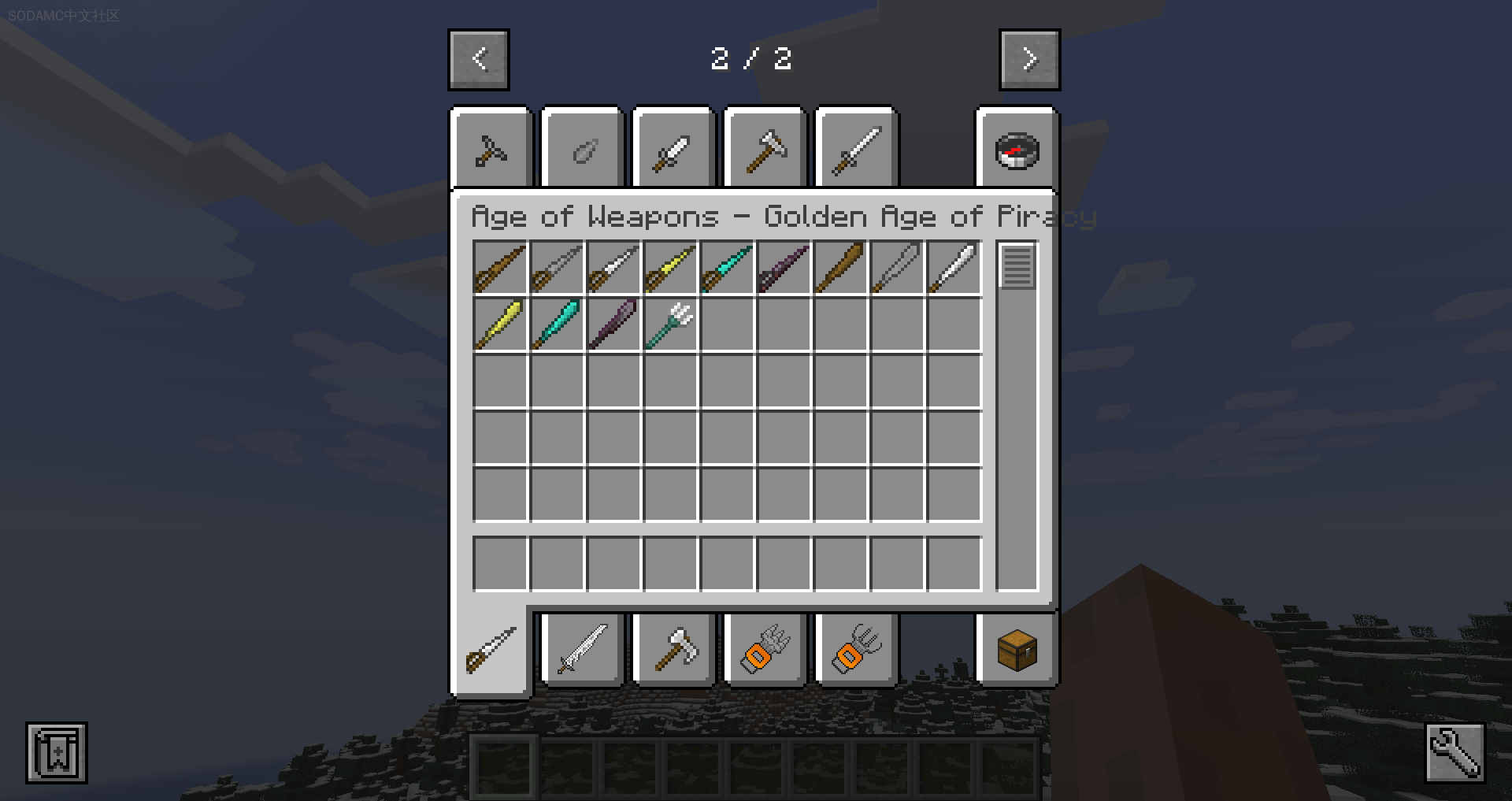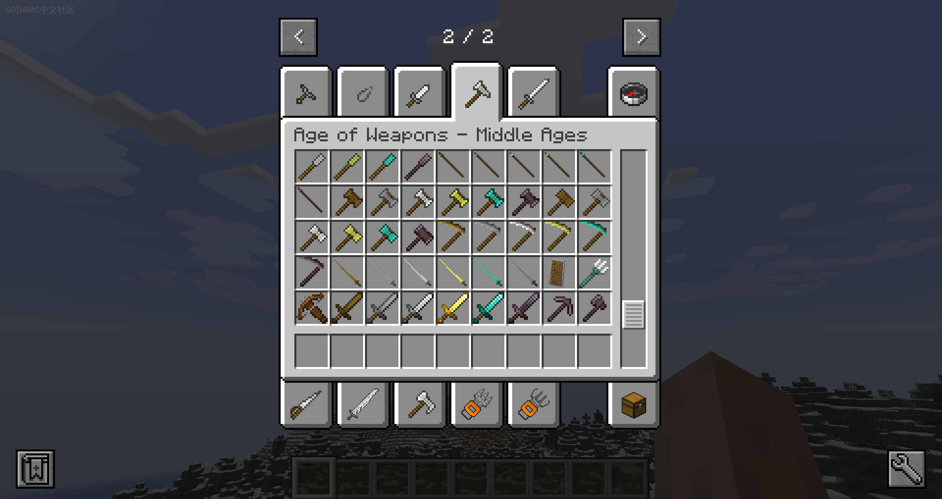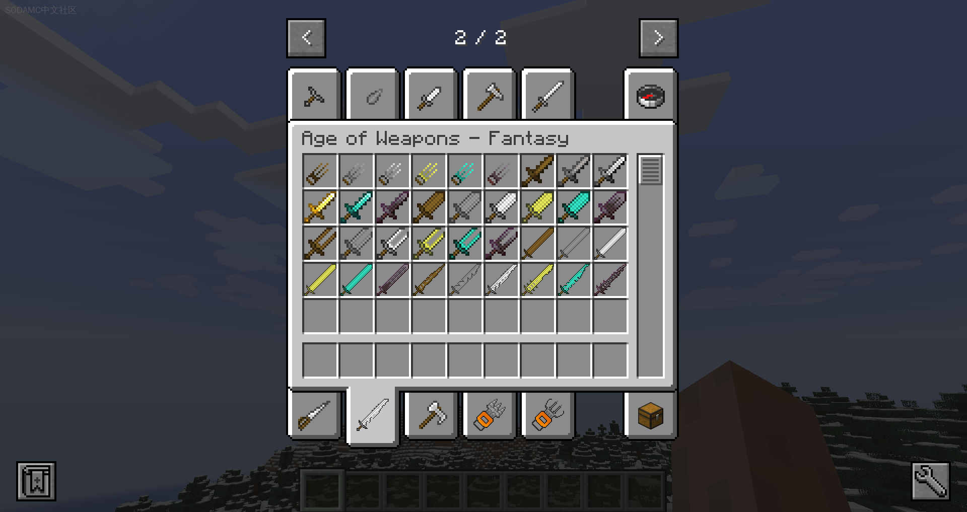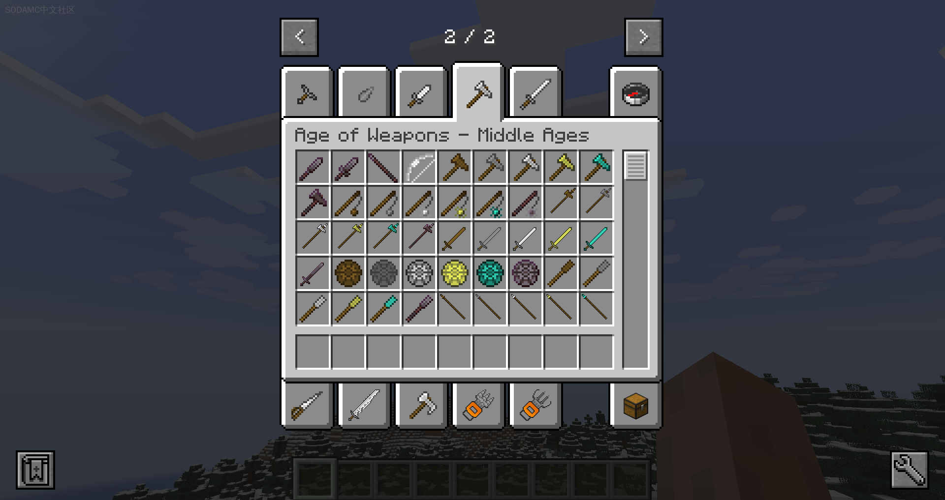 来自Modrinth所有游戏版本1.201.20.11.20.21.20.41.20.31.191.19.11.19.21.12.21.19.41.19.31.18.2所有类型forgeneoforgev.1.3.2cAgeOfWeapons - Reforged v.1.3.2c.jar下载v.1.3.2c#Release+ netherite tools are now fire resistant+ russia tranlation updated (by DanisimoQ2)展开版本: v.1.3.2c支持游戏: 1.20, 1.20.1, 1.20.2类型:ForgeRelease下载次数: 31,453v.1.4.4AgeOfWeapons-Reforged-1.20.4-(v.1.4.4-NEO).jar下载v.1.4.4#Release+ missing hatchet part recipes added+ missing gold knife part recipes added+ iron & gold blank smelting/blasting recipes added* some knife part recipe names fixed* recipes fixed* smoke grenade patchouli recipe fixed展开版本: v.1.4.4支持游戏: 1.20.4类型:NeoForgeRelease下载次数: 250v.1.4.0-pre3AgeOfWeapons-Reforged-1.20.2-(v.1.4.0-pre3-NEO).jar下载v.1.4.0-pre3#Beta+ missing hatchet part recipes added+ missing gold knife part recipes added+ iron & gold blank smelting/blasting recipes added* throwables fixed* some knife part recipe names fixed* recipes fixedJEI integration, Majrusz\'s Progressive Difficulty support & loot generation is in this version disabled.展开版本: v.1.4.0-pre3支持游戏: 1.20.2类型:NeoForgeBeta下载次数: 41v.1.3.5AgeOfWeapons-Reforged-1.20.4-(v.1.3.5).jar下载v.1.3.5#Release+ missing hatchet part recipes added+ missing gold knife part recipes added+ iron & gold blank smelting/blasting recipes added* some knife part recipe names fixed展开版本: v.1.3.5支持游戏: 1.20.3, 1.20.4类型:ForgeRelease下载次数: 355v.1.3.2bAgeOfWeapons-Reforged-1.20.x-(v.1.3.1b).jar下载1.3.2b#Release+ missing hatchet part recipes added+ missing gold knife part recipes added+ iron & gold blank smelting/blasting recipes added* some knife part recipe names fixed展开版本: 1.3.2b支持游戏: 1.20, 1.20.1, 1.20.2类型:ForgeRelease下载次数: 30,921v.1.4.3AgeOfWeapons-Reforged-1.20.4-(v.1.4.3-NEO).jar下载v.1.4.3#Release+ polish translation (by _vagus_)* missing german translation text added展开版本: v.1.4.3支持游戏: 1.20.4类型:NeoForgeRelease下载次数: 69v.0.15.2AgeOfWeapons-Reforged-1.19.x-(v.0.15.2).jar下载v.0.15.2#Beta* mob effect improvements* ProgressiveDifficulty support disabled展开版本: v.0.15.2支持游戏: 1.19, 1.19.1, 1.19.2类型:ForgeBeta下载次数: 1,339v.1.4.2AgeOfWeapons-Reforged-1.20.4-(v.1.4.2).jar下载v.1.4.2#Release* recipe updated展开版本: v.1.4.2支持游戏: 1.20.4类型:NeoForgeRelease下载次数: 1,899Legacy v.0.13.6Age-of-Weapons-1.12.2-(v.0.13.6).jar下载v.0.13.6#Beta* crafting bugfixes* language file bugfixes* small code changes and optimizations展开版本: v.0.13.6支持游戏: 1.12.2类型:ForgeBeta下载次数: 5,830v.1.3.2aAgeOfWeapons-Reforged-1.20.2-(v.1.3.2a).jar下载v.1.3.2a#Release* throwable explosives fixed* trowables tooltip fix展开版本: v.1.3.2a支持游戏: 1.20, 1.20.1, 1.20.2类型:ForgeRelease下载次数: 16,331v.1.3.4AgeOfWeapons-Reforged-1.20.4-(v.1.3.4).jar下载v.1.3.4#Release* throwable explosives fixed* trowables tooltip fix展开版本: v.1.3.4支持游戏: 1.20.3, 1.20.4类型:ForgeRelease下载次数: 523v.1.4.1AgeOfWeapons-Reforged-1.20.4-(v.1.4.1).jar下载v.1.4.1#Release* throwable explosives fixed* trowables tooltip fix展开版本: v.1.4.1支持游戏: 1.20.3, 1.20.4类型:NeoForgeRelease下载次数: 4,092v.1.4.0AgeOfWeapons-Reforged-1.20.4-(v.1.4.0).jar下载v.1.4.0#Release> Port for Neoforge 1.20.4+ JEI integration re-implemented+ chest loot re-implemented展开版本: v.1.4.0支持游戏: 1.20.3, 1.20.4类型:NeoForgeRelease下载次数: 622v.1.3.3AgeOfWeapons-Reforged-1.20.4-(v.1.3.3).jar下载v.1.3.3#Release> Port for MC 1.20.4展开版本: v.1.3.3支持游戏: 1.20.3, 1.20.4类型:ForgeRelease下载次数: 662v.1.4.0-pre2AgeOfWeapons-Reforged-1.20.2-(v.1.4.0-pre2).jar下载v.1.4.0-pre2#Beta* epic fight compatibility fixed* version checker fixed & improvedJEI integration, Majrusz\'s Progressive Difficulty support & loot generation is in this version disabled.展开版本: v.1.4.0-pre2支持游戏: 1.20.2类型:NeoForgeBeta下载次数: 84v.1.3.2AgeOfWeapons-Reforged-1.20.x-(v.1.3.2).jar下载v.1.3.2#Release* epic fight fix展开版本: v.1.3.2支持游戏: 1.20, 1.20.1, 1.20.2类型:ForgeRelease下载次数: 3,101v.1.4.0-pre1AgeOfWeapons-Reforged-1.20.x-(v.1.4.0-pre1).jar下载v.1.4.0-pre1#Beta> Port for NeoforgeJEI integration, Majrusz\'s Progressive Difficulty support & loot generation is in this version disabled.展开版本: v.1.4.0-pre1支持游戏: 1.20.2类型:NeoForgeBeta下载次数: 93v.1.3.1AgeOfWeapons-Reforged-1.20.x-(v.1.3.1).jar下载v.1.3.1#Release+ recipe categories added+ \"tools\" item tag added* Majruszs Progressive Difficulty fix for newer versions展开版本: v.1.3.1支持游戏: 1.20, 1.20.1, 1.20.2类型:ForgeRelease下载次数: 240v.1.3.0AgeOfWeapons-Reforged-1.20.x-(v.1.3.0).jar下载v.1.3.0#Release+ throwing feature added to some regular weapons* small improvements* armor knockback fixed展开版本: v.1.3.0支持游戏: 1.20, 1.20.1, 1.20.2类型:ForgeRelease下载次数: 454v.1.2.3AgeOfWeapons-Reforged-1.20.x-(v.1.2.3).jar下载v.1.2.3#Release+ JEI legendary item description added* throwing weapon stats buffed* crafting hammer added to the hammers item tag* prevent smoke- & poison grenades from dropping* smoke grenade improved* armor durabilities fixed* dynamite recipe changed (more output)* explosive mines does not spread fire on explosion* explosive mine recipe changed展开版本: v.1.2.3支持游戏: 1.20, 1.20.1, 1.20.2类型:ForgeNeoForgeRelease下载次数: 608v.1.2.2AgeOfWeapons-Reforged-1.20.x-(v.1.2.2).jar下载v.1.2.2#Release+ Immersive Engineering metal press recipes added+ mod support for some recipes added+ weapon book content added展开版本: v.1.2.2支持游戏: 1.20, 1.20.1, 1.20.2类型:ForgeNeoForgeRelease下载次数: 193v.1.2.1AgeOfWeapons-Reforged-1.20.x-(v.1.2.1).jar下载v.1.2.1#Release* hotfix related to the BleedingEffect展开版本: v.1.2.1支持游戏: 1.20