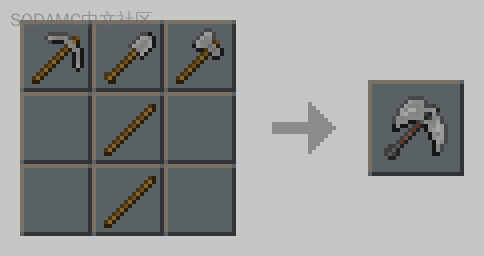 制作这些 Paxels 的配方为:2 根木棍(1x 底部中间,1x 中间),同级别的镐(顶部左侧),同级别的铲子(顶部中间)和同级别的斧头(顶部右侧)。