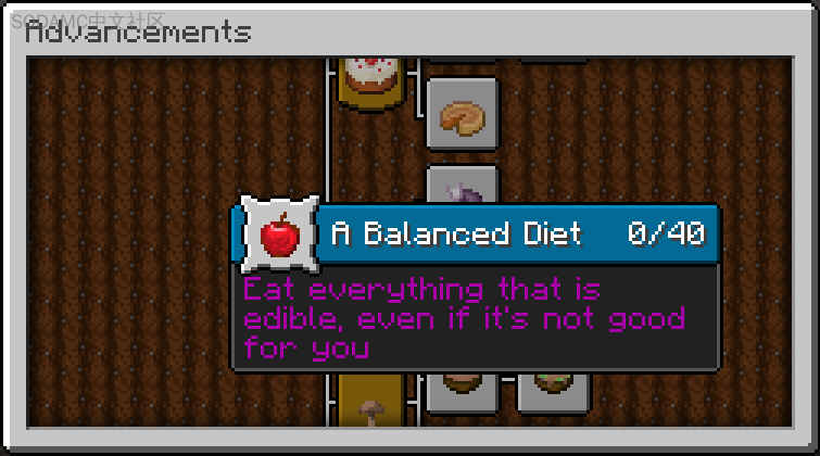 将解锁一个新的进度标签,显示您已经吃过和尚未吃过的食物,用于原版的“平衡饮食”成就(在画廊中有完整的概览)。